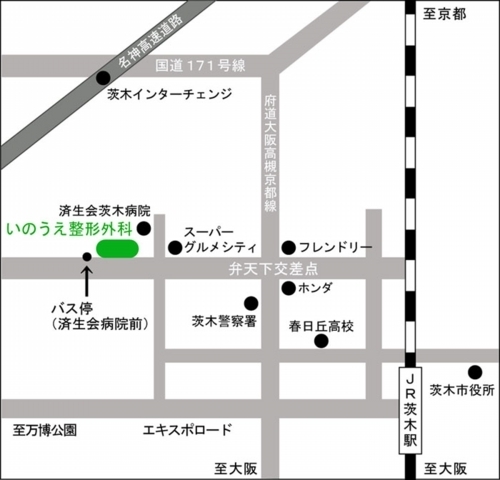 名神茨木IC出口から府道大阪高槻京都線(産業道路)を南下、「弁天下」交差点を西方へ右折。